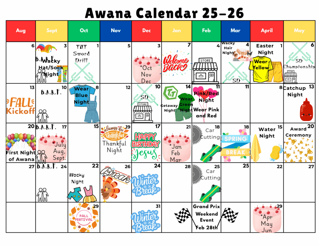 Awana is an exciting children’s ministry during the school year on Wednesdays at 6:30-8:00 PM. Bible memorization is the focus, but we also have energetic games and lots of fun activities! Each age group has their own unique club.